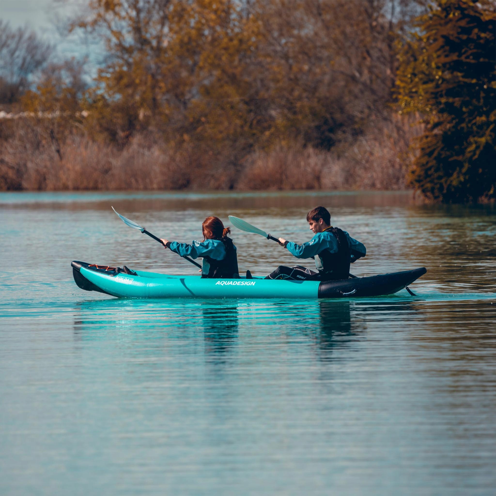 Aquadesign Koloa 360 — это надувной двухместный каяк внушительной длины 360 см, обеспечивающий комфортное размещение двух человек. Его внешняя ширина 100 см и внутренняя ширина 46 см при максимальной нагрузке 215 кг делают его идеальным каяком для многих водных видов спорта. Необычайная стабильность и жесткость Koloa 360 являются результатом инновационного пола, изготовленного по технологии Dropstitch, позволяющей надувать давление до 10 фунтов на квадратный дюйм. Эта особенность позволяет каяку сохранять отличную жесткость даже в более сложных условиях.