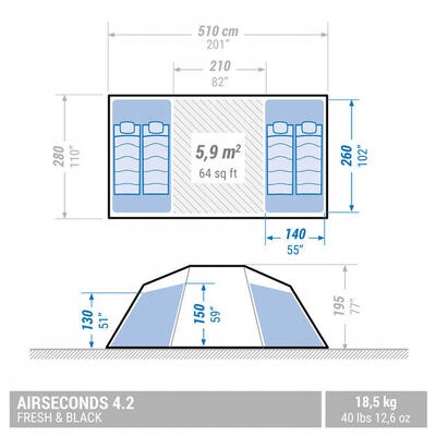 Разработанная нашей командой опытных туристов, четырехместная надувная палатка Air Seconds 4.2 Fresh & Black с 2 спальнями и большим тамбуром. Наша цель? Создайте надувную, легко складывающуюся палатку, изготовленную по технологии Fresh&Black. Холодно и темно. Решите, в какое время вы хотите проснуться!