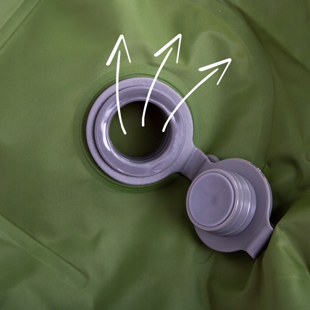 Внизу имеется стандартный надувной клапан , который позволяет надувать коврик с помощью насоса или рта. Вы также можете оценить подушку для наступления, которая позволяет надувать коврик, даже если у вас нет насоса или у вас малый объем легких. Все, что вам нужно сделать, это наступить на него или несколько раз сжать и коврик готов!
