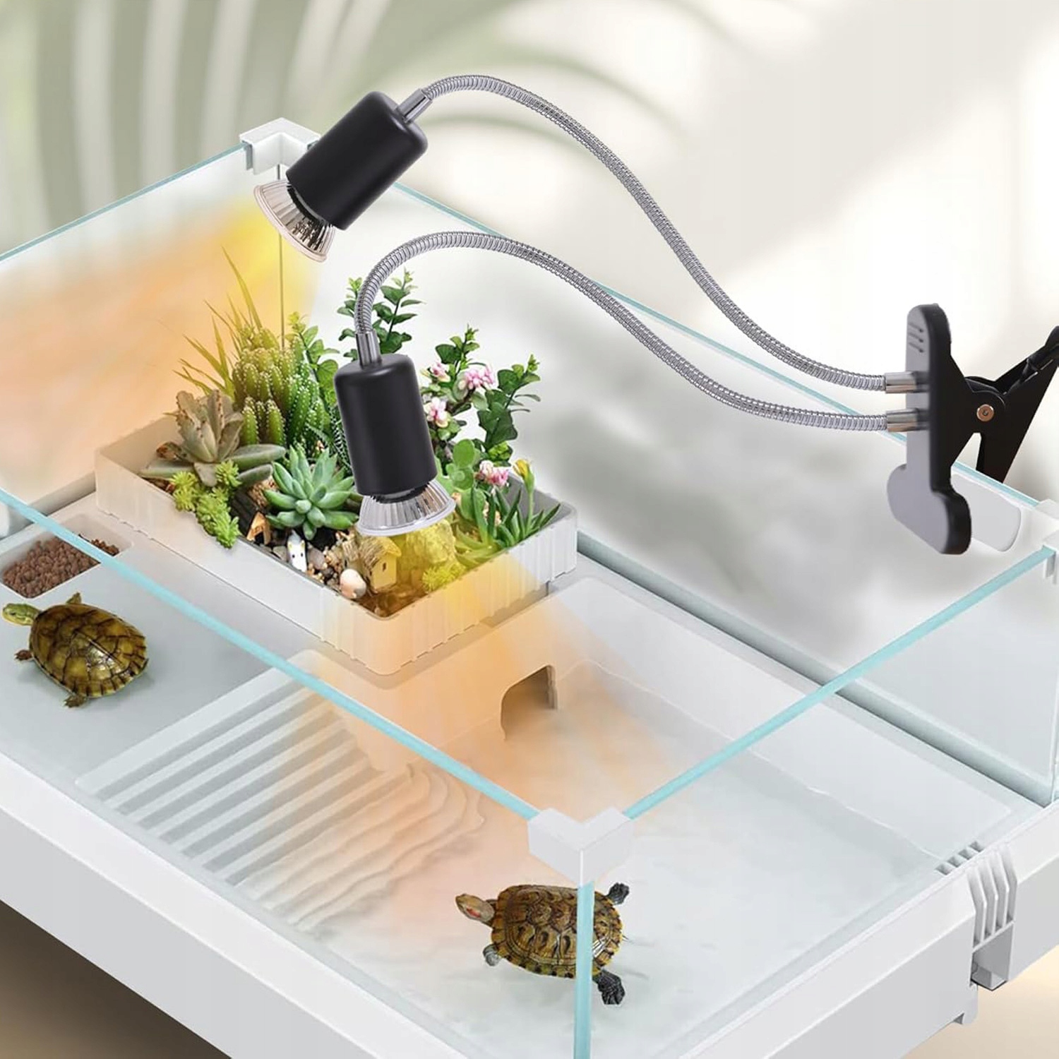🐢【2 груши для рептилий】 В лампе для рептилий с двойной головкой используется процесс нанесения покрытия, обеспечивающий антиоксидантные и взрывобезопасные свойства. В комплект входит 1 отражатель мощностью 25 Вт и 1 отражатель мощностью 50 Вт. Имитирует солнечный свет и обеспечивает соответствующие ультрафиолетовые лучи и температуру для удовлетворения потребностей рептилий в их естественной среде обитания.