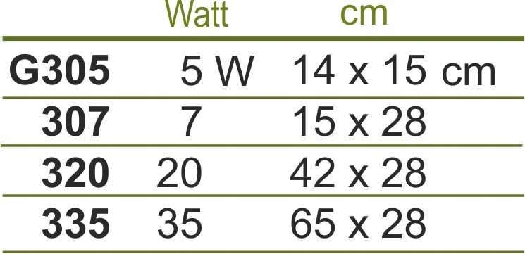 <р> Терра Мат G305 5 Вт 14 х 15 см Терра Мат G307 7 Вт 15 х 28 см Терра Мат G320 20 Вт 42 х 28 см Терра Мат G335 35 Вт 65 x 28 см <р>