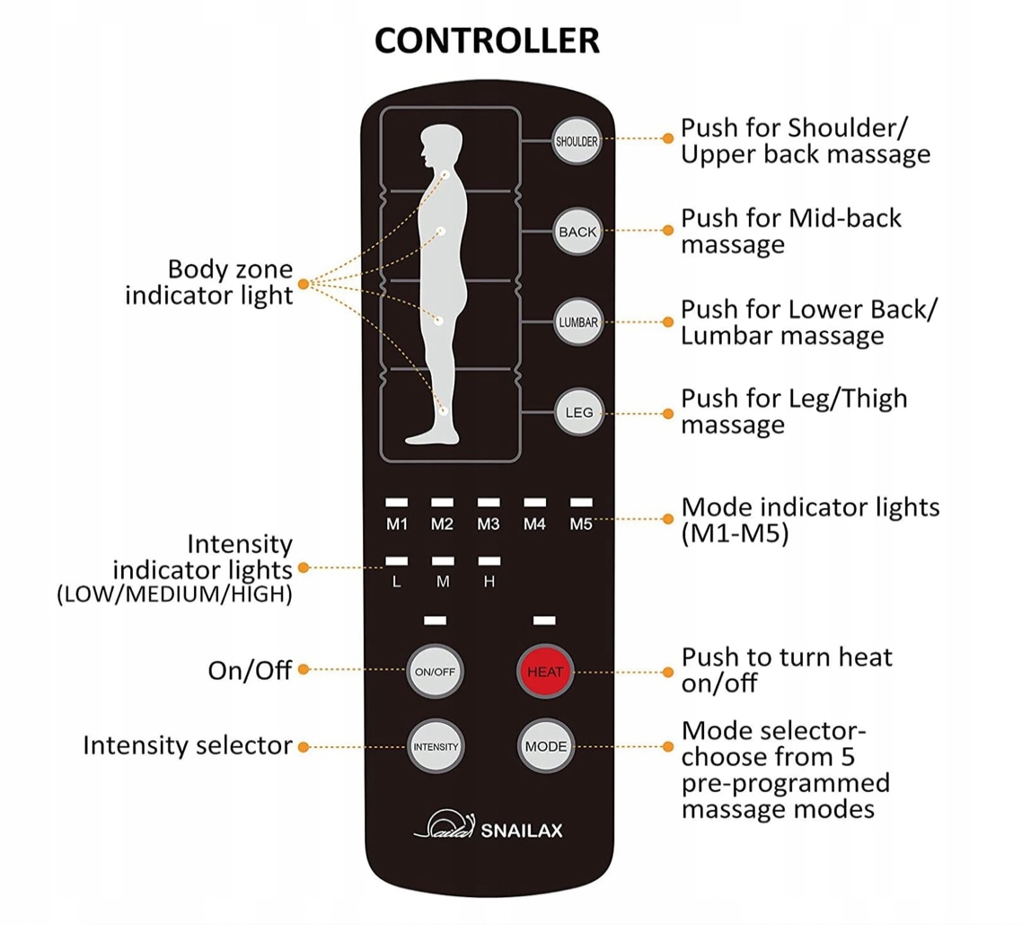 Массажный коврик SNAILAX SL-363M-EU сочетает в себе 10 бодрящих массажных моторов и 4 грелки. Существует пять режимов массажа, воздействующих на различные области тела, включая плечи, спину, бедра и ноги. Также есть три варианта интенсивности вибрационного массажа. Отличный выбор для зон, которые вы хотите массировать, и с желаемой интенсивностью. Дополнительная функция подогрева расслабляет напряженные мышцы и облегчает стресс долгого дня.