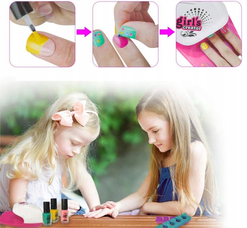 Этот красивый набор NAIL STUDIO - идеальный подарок для всех маленьких леди, в нем собрано все, что пригодится маленькому стилисту, который любит получайте удовольствие, подражая ее матери. Этот набор идеально подходит для детей, поскольку лаки для ногтей не содержат токсичных и опасных для здоровья веществ. Они совершенно безопасны и очень легко удаляют лак с ногтей. В комплект входит фен с вентилятором на 2 батарейки АА, лаки для ногтей, наклейки для ногтей, блестки, разделители для ног и пилочка в форме сердечка. У сушилки есть вентилятор, после покраски ногтей засуньте руку в сушилку и нажмите на дно. Это ускоряет процесс высыхания лака. Чтобы снять лак, достаточно аккуратно поддеть слой и потянуть его вверх, после чего лак сойдет сам. Это развлечение, которое идет рука об руку с обучением. Отличный способ творчески развлечься.