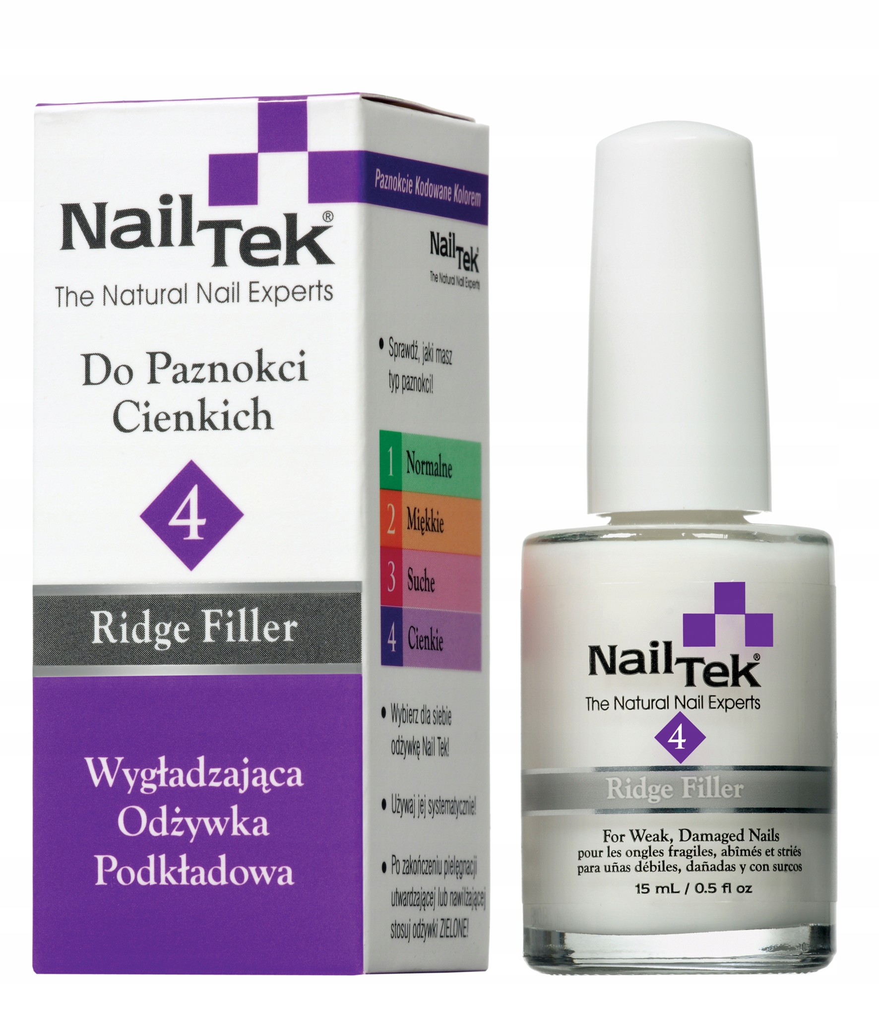 Nail Tek 4 Ridge Filler – Сильно затвердевающая база-кондиционер для тонких ногтей, с натуральными наполнителями, молочно-белого цвета, для использования под цветной лак для ногтей. Разглаживает ногтевую пластину и маскирует ее изменения цвета. Делает ногти идеально гладкими.