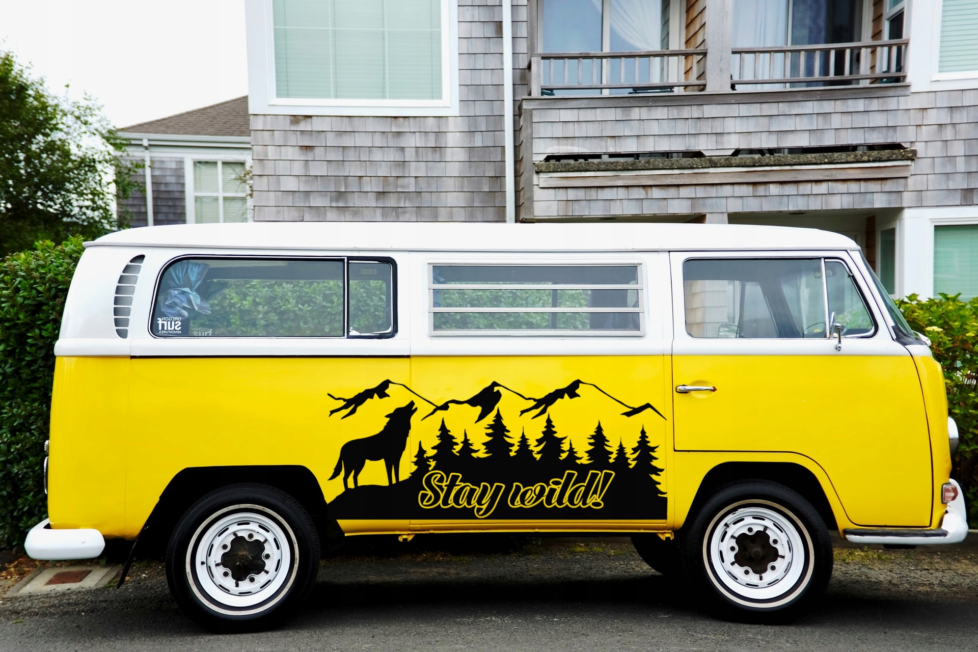 Тематика В предложении представлена наклейка, предназначенная для наклеивания на автомобиль, фургон или кемпер. На нем изображен горный мотив с волком. Наклейка не имеет фона, она вырезана выбранного цвета из матовой самоклеющейся фольги немецкой компании Oracal. После наклейки на автомобиль остаются только элементы, выделенные черным цветом на фото ниже.