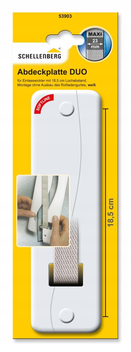 Накладка Schellenberg DUO подходит для лент роллет шириной 18/23 мм и поэтому могут быть идеально интегрированы в систему рулонных штор Schellenberg MAXI. Заглушка DUO подходит для входных намоточных устройств с расстоянием между отверстиями 18,5 см.