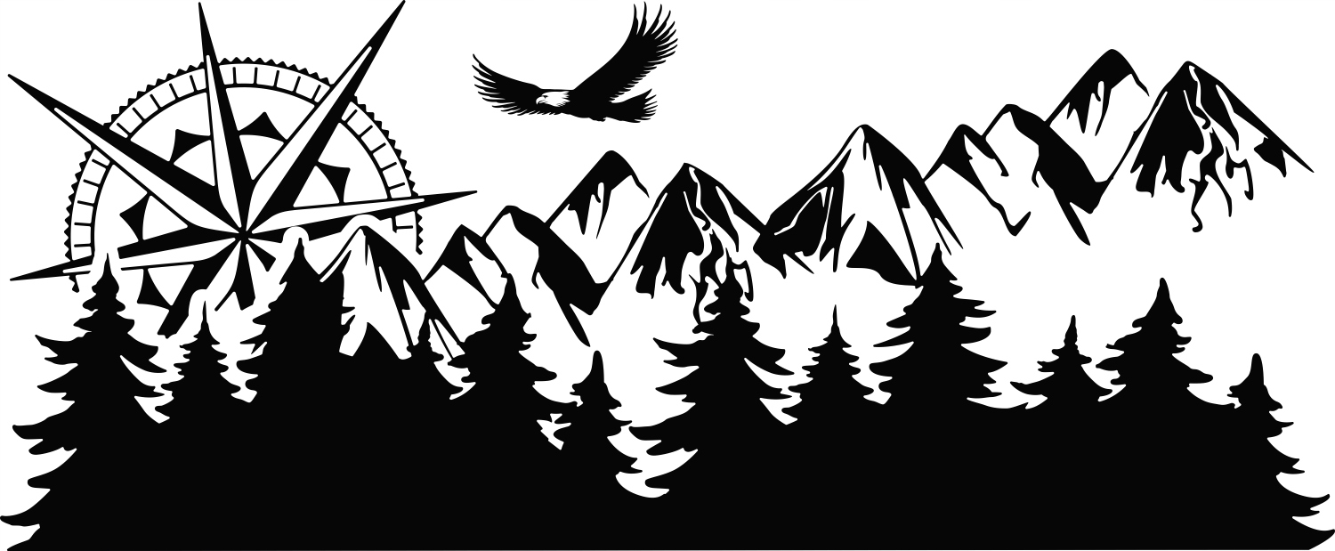 Тематика В предложении представлена наклейка, предназначенная для наклеивания на автомобиль, фургон или кемпер. На нем изображены горный массив, лес и роза ветров. Наклейка не имеет фона, она вырезана выбранного цвета из матовой самоклеющейся фольги немецкой компании Oracal. После наклеивания на автомобиль остаются только те элементы, которые показаны черным на фото ниже.