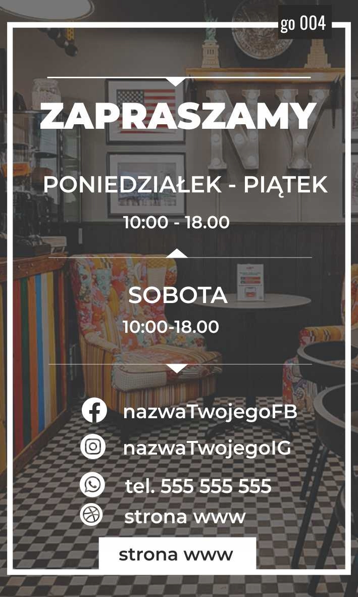 ПРИМЕР: ШАБЛОН: G_05, ЦВЕТ: Красный, ТИП: Для улицы, ТЕКСТ: понедельник-пятница 10:00-18:00; Суббота 10:00-14:00 Ig: ваш Instagram, FB: ваше имя в Facebook, телефон: ваш номер