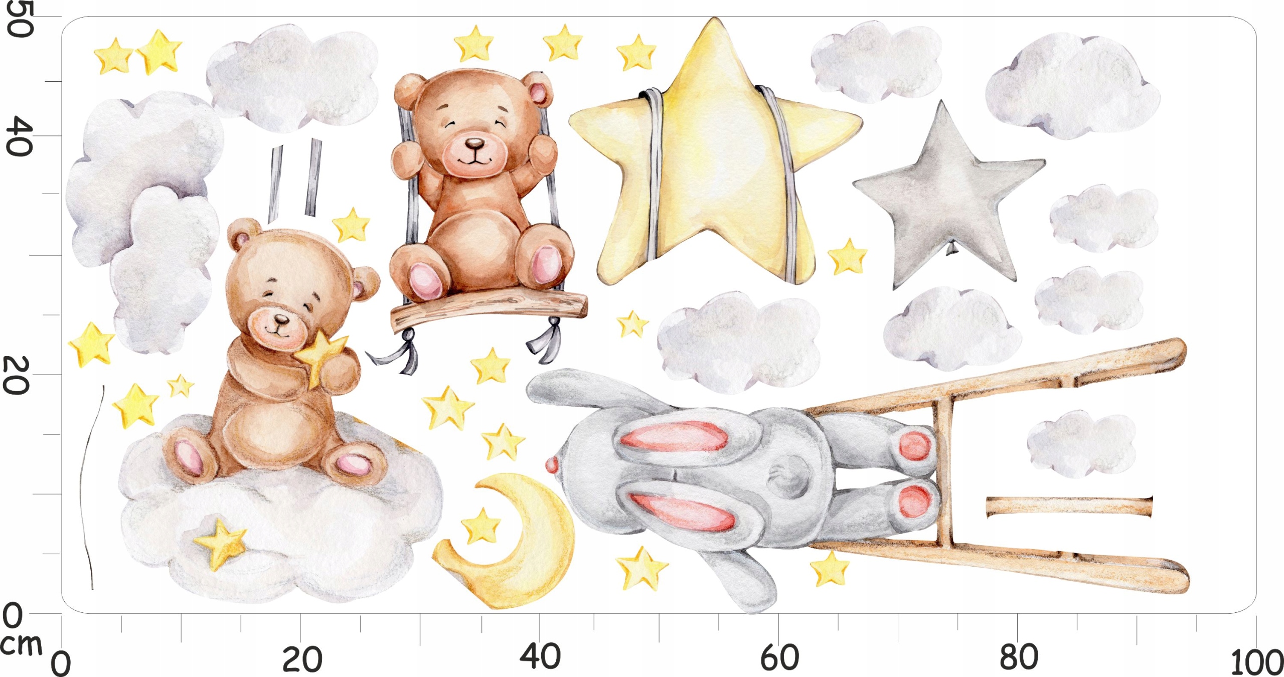 Детские наклейки на стену – прекрасный способ украсить детскую комнату, лучше и не найти более простой способ полного преображения стены. Мишки Тедди и кролик среди звезд и облаков в пастельных тонах – нежное украшение, которое хорошо впишется в любую детскую комнату.