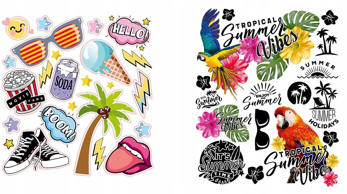 Представленная модель представляет собой элегантные наклейки с праздничными надписями «Лето», «Тропический» и красивыми попугаями ара. Идеально подойдет для отпуска, не обязательно в тропики :) Стоит также обратить внимание на очень детальную отделку термотрансферов и яркие цвета попугаев и цветов.