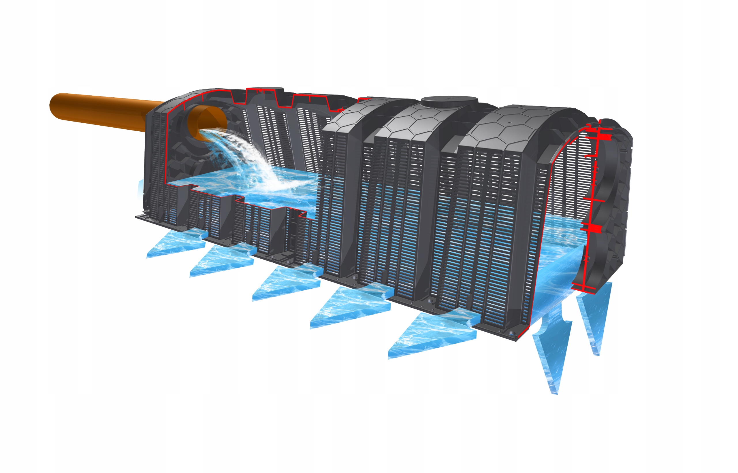 Тоннель размещается в земле, создавая гравитационные инфильтрационные слои. . Туннель имеет продольные щели на боковых стенках, через которые сточные и дождевые воды могут отводиться в землю.