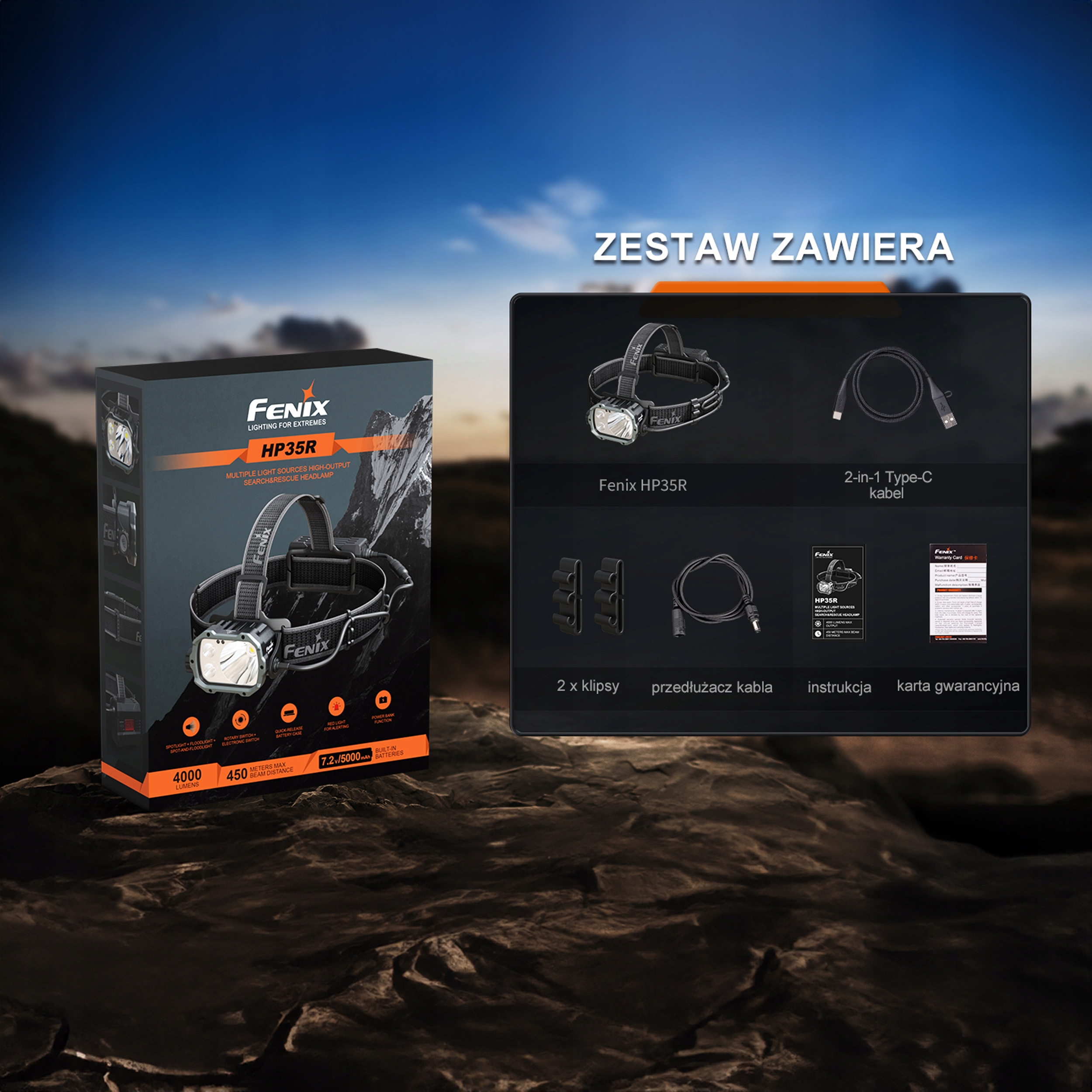 Fenix HP35R — усовершенствованный поисково-спасательный налобный фонарь, излучающий свет мощностью до 4000 люмен и дальностью действия 450 метров.