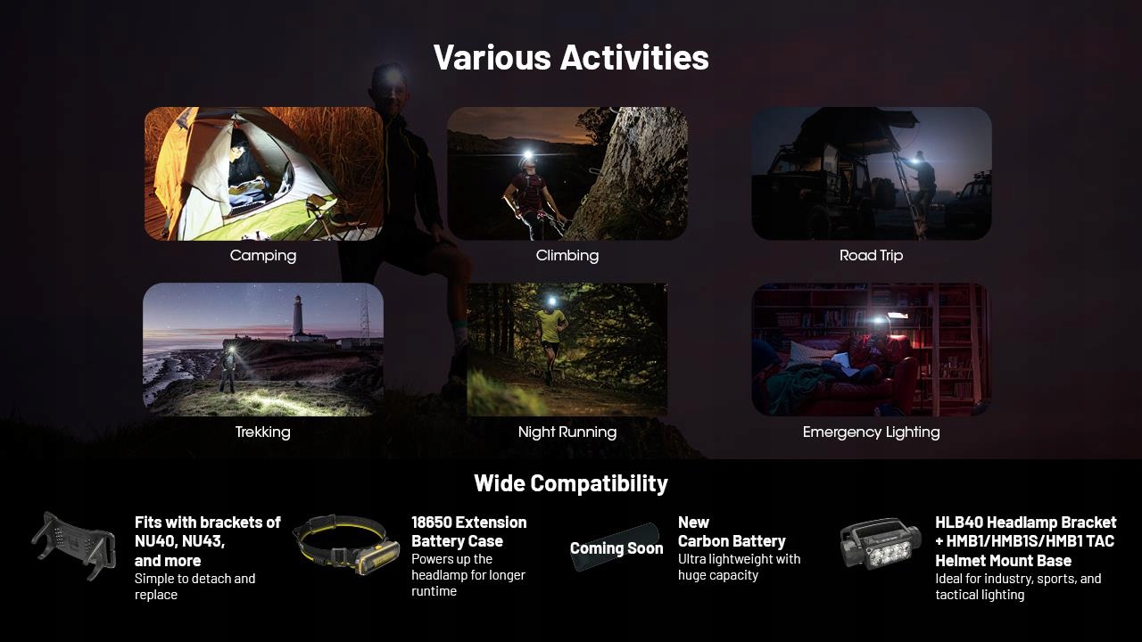 Питание от входящего в комплект литий-ионного аккумулятора 18650 4000 мАч обеспечивает превосходное время автономной работы (до 82 часов в режиме сверхнизкого энергопотребления) и удобную перезарядку через USB-C. Налобный фонарь имеет прочный корпус из авиационного алюминиевого сплава, водонепроницаемый по стандарту IP68 (выдерживает погружение на глубину до 2 метров) и удароустойчивый до 2 метров, что обеспечивает надежность в суровых условиях. Он управляется с помощью интуитивно понятных двойных переключателей и оснащен удобным дышащим оголовьем с дополнительным верхним ремнем для дополнительной устойчивости.