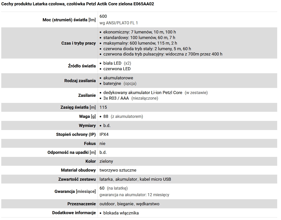 Максимальная сила света налобного фонаря Actik Core составляет 600 люмен и дальность действия 115 метров. Три уровня мощности белого света (максимальный, нормальный и экономичный, направляющий световой луч на индивидуальные нужды. Время освещения составляет 2 часа для максимального режима, 7 часов для обычного режима и 100 часов для экономного режима.