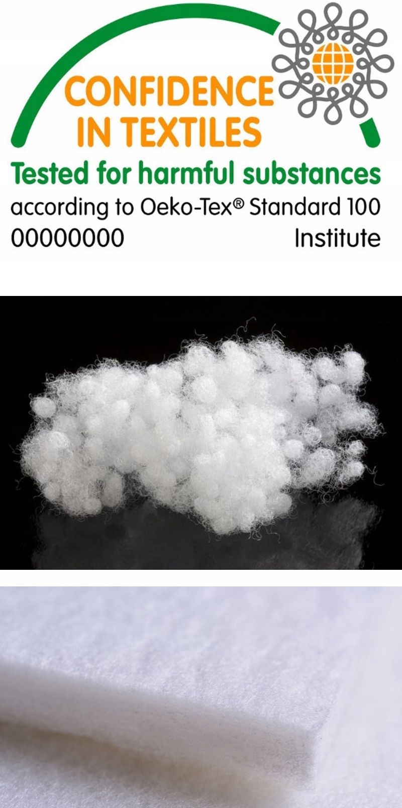 Силиконовое волокно является наполнителем коврика. В производстве используются только новые волокна, без переработанных добавок. Волокно белое, чистое и свежее. Благодаря использованию очень качественного сырья флизелин обладает противоаллергическими свойствами, воздушен, не имеет запаха, не впитывает влагу и не выделяет никаких химических соединений.