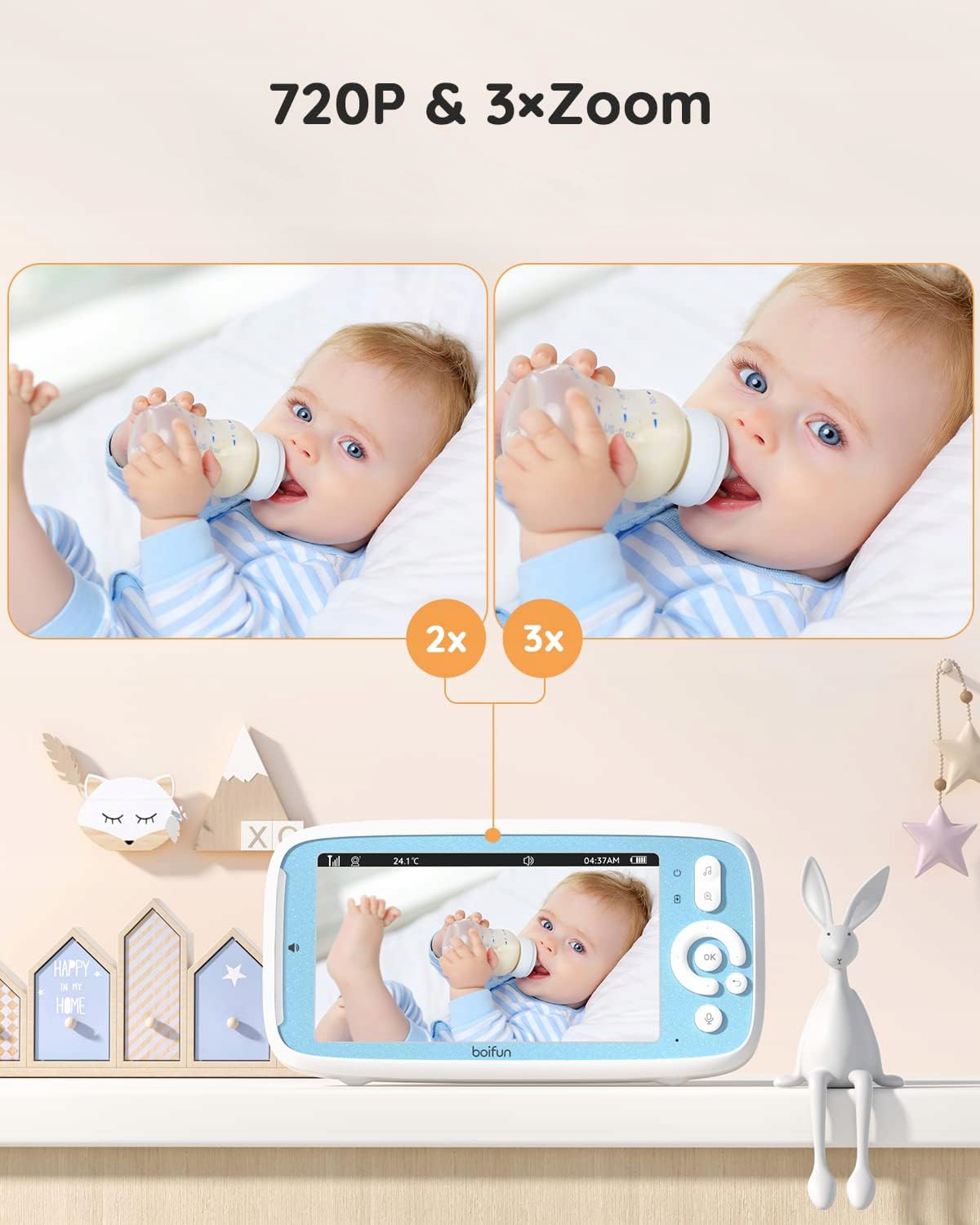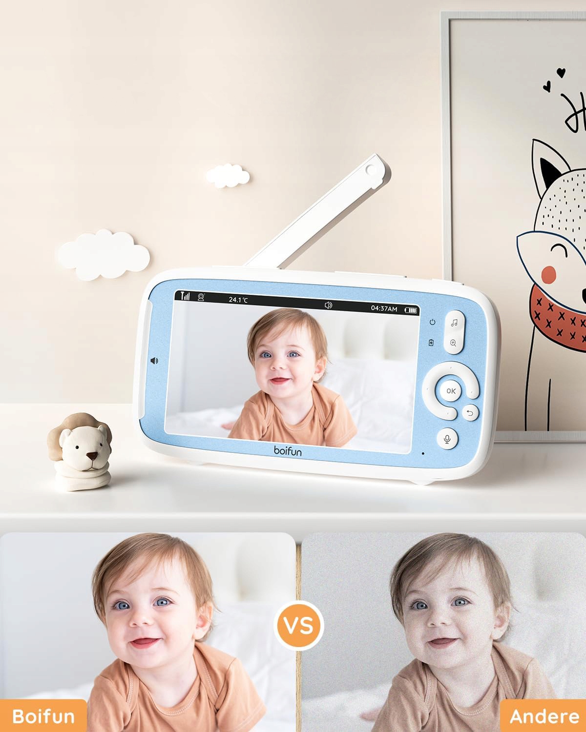 Наслаждайтесь четким и подробным изображением благодаря электронному няни Boifun 720p и 5-дюймовому дисплею IPS. Больший размер экрана облегчает наблюдение за ребенком, а технология IPS дает возможность наблюдать за малышом под любым углом с отличными цветами и контрастностью.