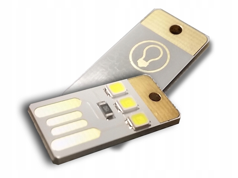 Фонарик, лампа для USB-порта, чуть больше самого порта. Лампа имеет форму печатной платы, вставленной в порт таким образом, что выступает из него всего на несколько миллиметров.] Три очень ярких, даже ослепляющих диода, генерируют очень много света.