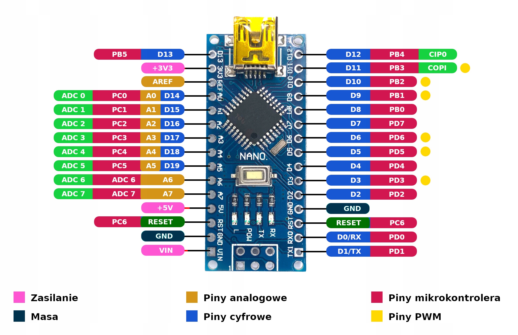 - 7-9В через VIN (теоретически до 12В, но рекомендуем меньше из-за возможности перегрева стабилизатора - то же самое касается и оригинального Нано)