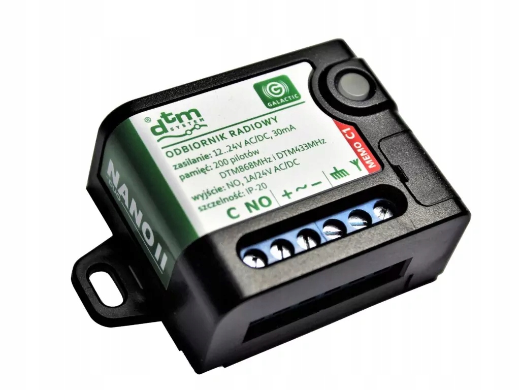 NANO2 DUO — 1-канальный приемник в компактном корпусе. Он создан для пользователей, которые ценят простоту установки. Он характеризуется очень простым управлением при сохранении высокой функциональности. Он оснащен разъемом USB, позволяющим управлять пультами дистанционного управления, работающими в системах DTM433MГц и DTM868MГц. Он предназначен для работы с контроллерами ворот, рольставней и другими устройствами автоматизации.