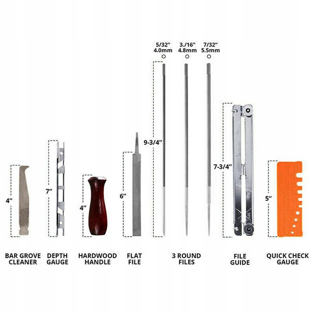 Размер: (прибл.) 3 круглых напильника: 5/32 дюйма (4,0 мм), 3/16 дюйма (4,8 мм) и 7/32 дюйма (5,5 мм) для 3/8 дюйма LP, 0,325 дюйма и 3 шаг /8