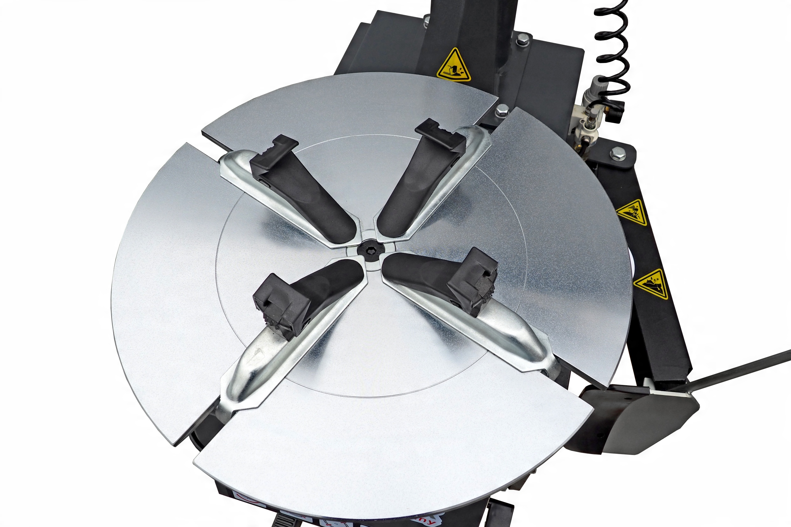 - Стол шиномонтажного станка оснащен двумя исполнительными механизмами. Приводы, перемещающие зажимы, обеспечивают точную центровку и фиксацию держателя колеса.