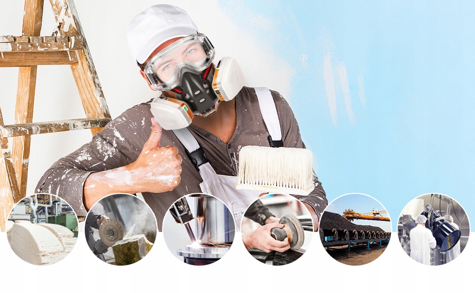 ☑️ГУМАНИЗИРОВАННЫЙ ДИЗАЙН:Противогаз с фильтрами, гибким регулируемым оголовьем и маской подходит для большинства форм головы. Даже если вы носите очки, очки обеспечивают надежную защиту глаз. Работайте более комфортно и безопасно с пылезащитной маской.