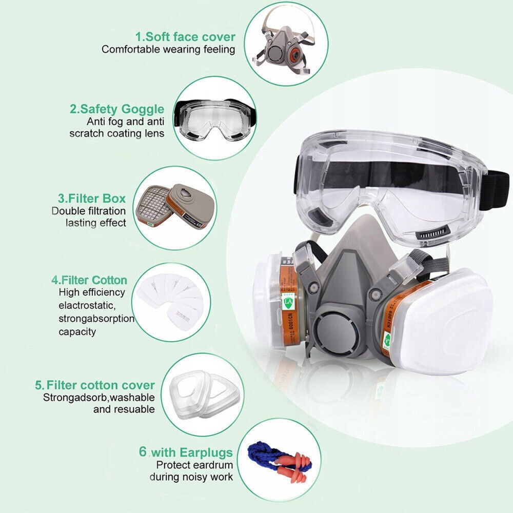 【Защита слуха】 Наша профессиональная полумаска использует двойную систему фильтрации для эффективной блокировки частиц в воздухе. Очки предотвращают распыление тумана и попадание мелких веществ. Беруши защищают нежную барабанную перепонку во время шумной работы и подходят для большинства размеров головы. Этот респиратор разработан для плотного и удобного ношения.