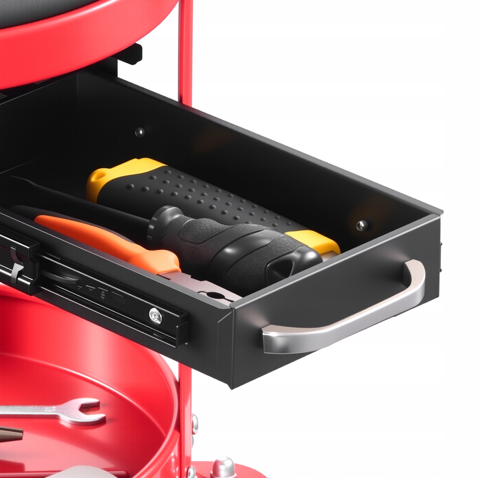 Практичное место для хранения: этот передвижной стул механика оснащен двумя ящиками, лотком для инструментов и двумя держателями банок, что обеспечивает достаточно места для хранения инструментов и аксессуаров, делая ваше рабочее пространство более аккуратным и организованным.