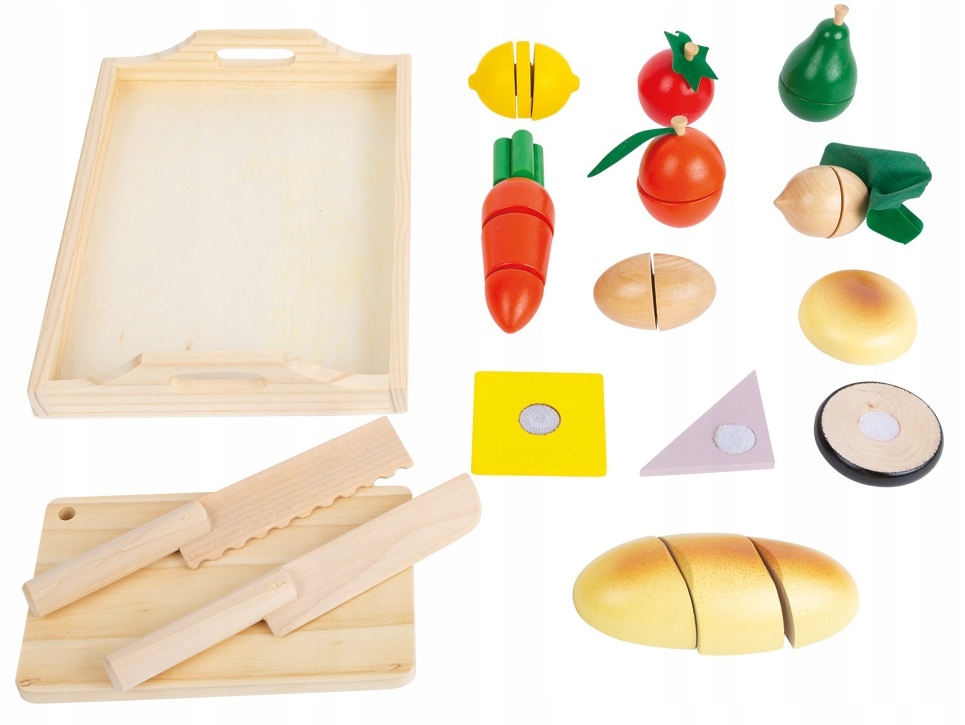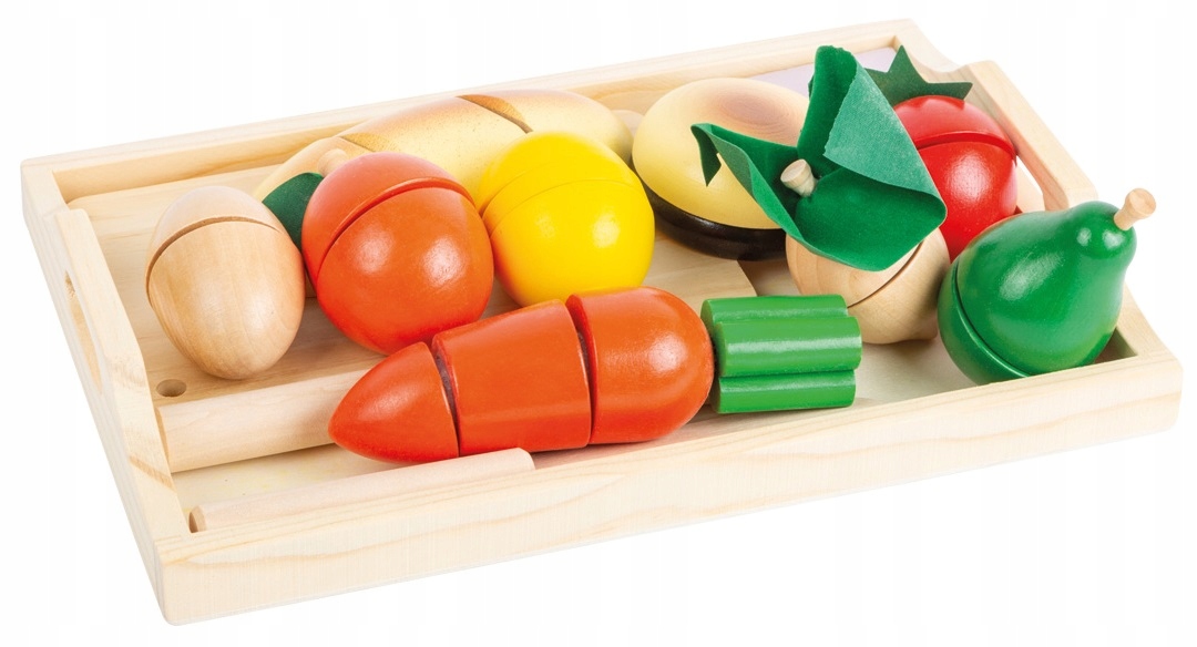 Набор создан не только для развития моторики ребенка, но и для поощрения здорового питания. Здесь вы найдете не только хлеб и то, что мы традиционно добавляем в него, но и множество овощей и фруктов. Все на удобном подносе. Все сделано из дерева, по отличной цене, что является большим преимуществом.