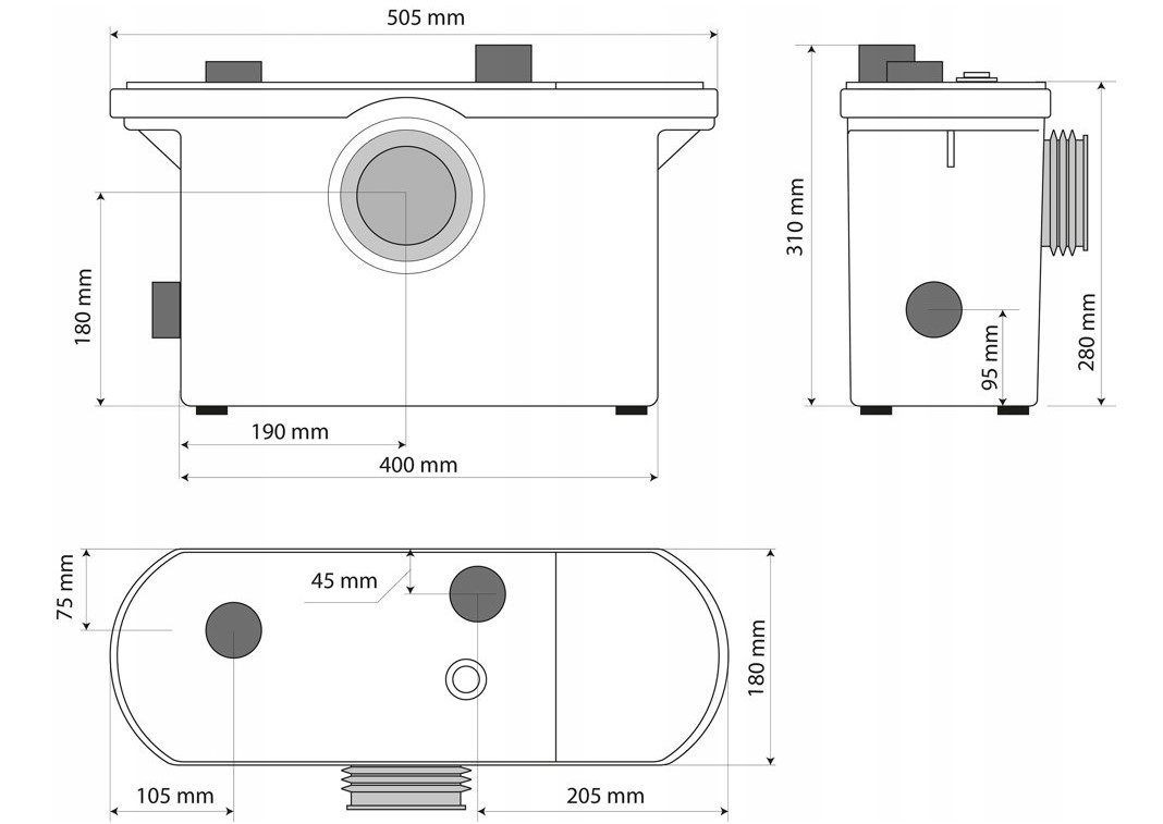Туалетная насосная станция применяется для перекачивания канализационных стоков везде, где унитаз расположен на большом расстоянии от канализационной магистрали или находится ниже уровня так называемого противотока. Универсальная насосная станция, можно использовать в туалете и после закрытия входа в туалет в прачечной или на кухне. Два входа для любых устройств, таких как умывальник, стиральная машина, душ, ванна + вход для туалета