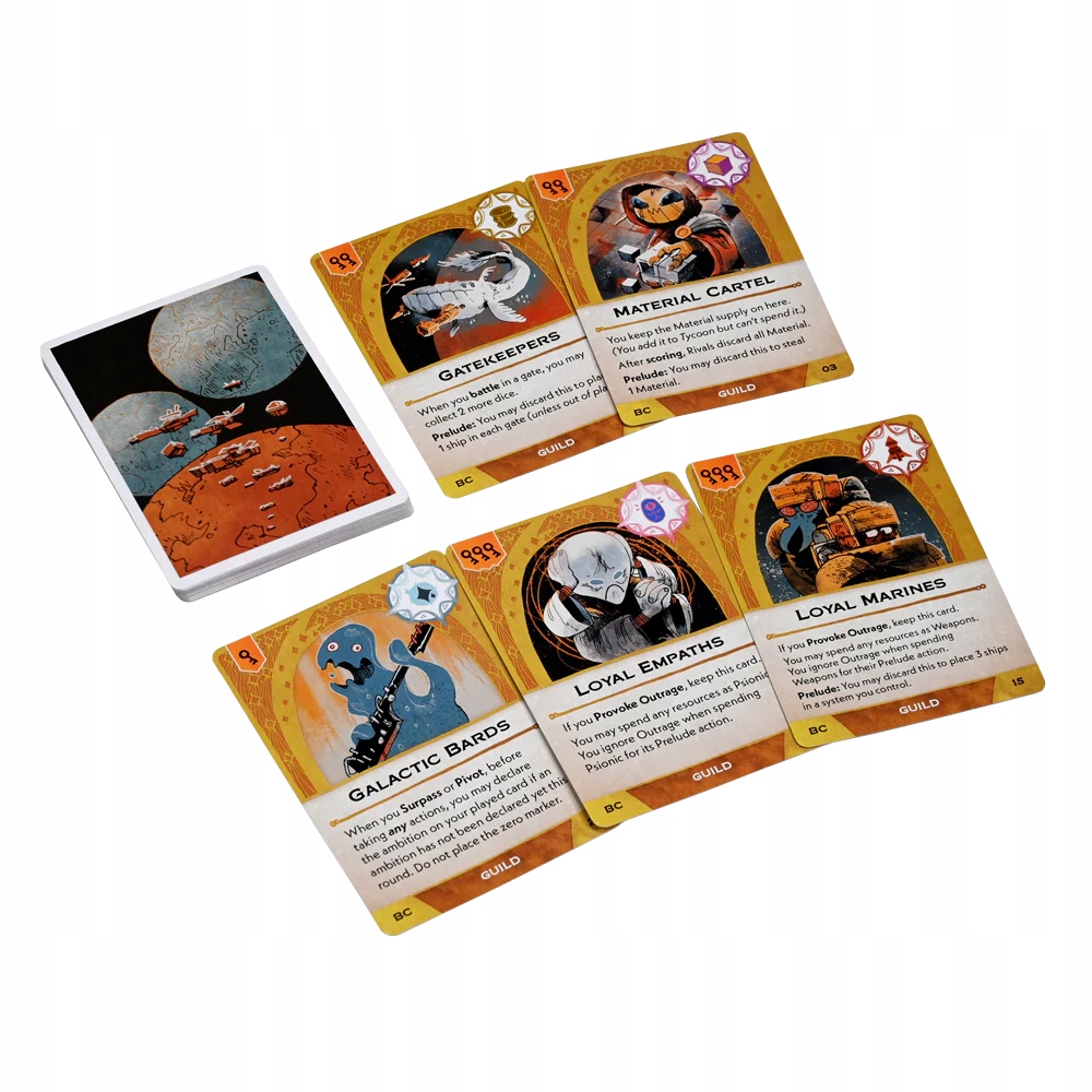 <ул>Каждая игра содержит сотню деревянных кораблей и агентов, 18 кубиков с индивидуальной гравировкой, красивую доску из шести панелей и множество карточек с более чем 60 уникальными произведениями искусства.