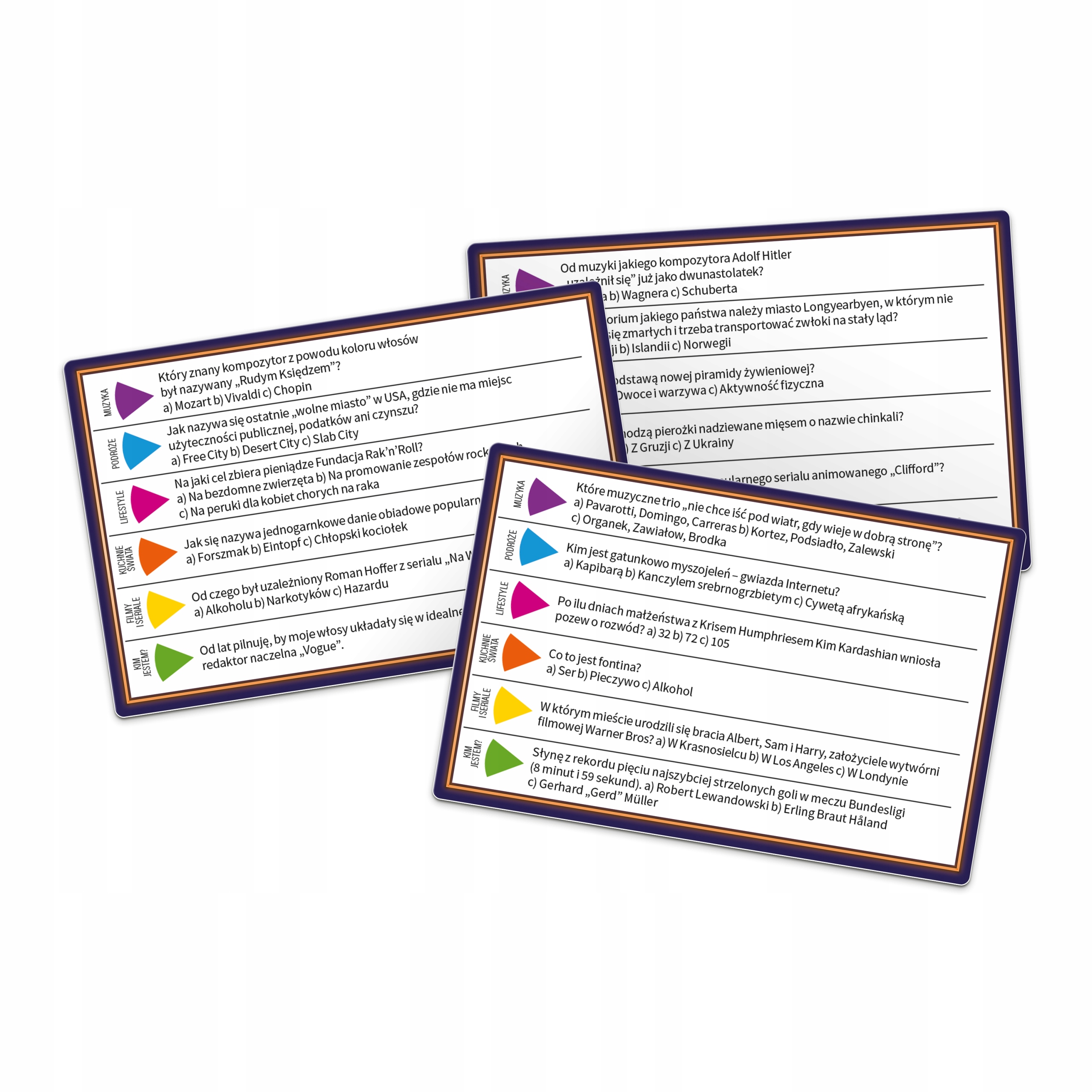 Наверное, много. Ответ вам придется искать на картах Trivial Pursuit Domówka Ultimate. Вопросы разделены на категории «Музыка», «Путешествия», «Образ жизни», «Мировая кухня», «Фильмы и сериалы» и «Кто я». Позвольте себе удивить оригинальными изделиями во время семейного ужина, вечеринки с друзьями или вечера на двоих! Набор содержит до 1800 неизвестных вопросов, которые требуют всесторонних знаний или немного хитрости и навыков дедукции.
