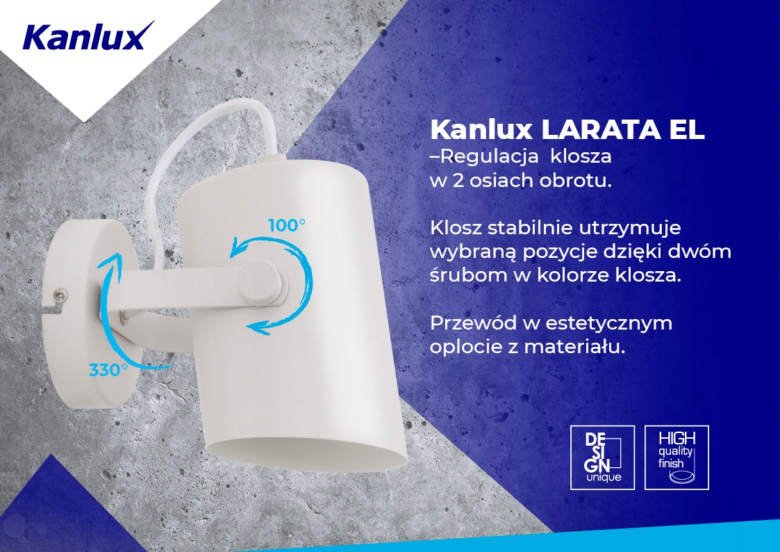 Kanlux LARATA E27 — настольная лампа из стали. Качество изготовления и сам корпус придают светильнику элегантность и современный вид. Настольная лампа Kanlux LARATA – это уникальный продукт, созданный с вниманием к каждой детали. Благодаря своему весу светильник устойчиво держится на поверхности и не раскачивается. Кронштейн регулируется с помощью двух элегантных винтов, а видимый кабель уложен в эстетичную оплетку.