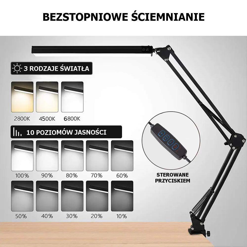 Настольная лампа - незаменимый элемент нашего существование, которое может пригодиться во многие моменты нашей жизни – для учебы, работы или чтения. Мы можем использовать настольную лампу в мастерской, гараже или даже на кухне. Он имеет 80 светодиодов, объединенных в одном месте с современной электронной системой, обеспечивающей высокую мощность при низком энергопотреблении. Лампа имеет вращающийся кронштейн, функцию переключения памяти и разъем USB. Настольная лампа имеет 3 цвета свечения и 10 уровней яркости.