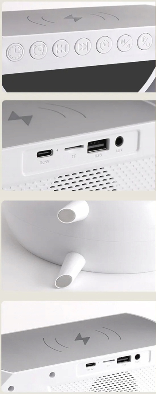 ▶ Устройство имеет несколько практичных функций: беспроводное зарядное устройство, радио, динамик, генератор белого шума, часы и лампа
