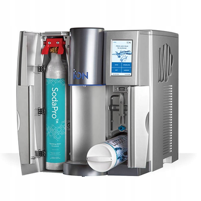 Настольный диспенсер для воды для офиса отличается уникальной функциональностью, позволяющей установить малый или большой баллон с пищевым газом в зависимости от доступного места в помещении. комната. Конструкция устройства ION400 допускает установку баллона меньшего размера внутри настольного дозатора, а при наличии достаточного места в помещении для подключения - установку баллона большого размера, который следует разместить на небольшом расстоянии от автомата. Такое решение чрезвычайно удобно и эффективно, ведь бутылки объемом 3,7 литра достаточно для приготовления 700-800 литров газированной воды!