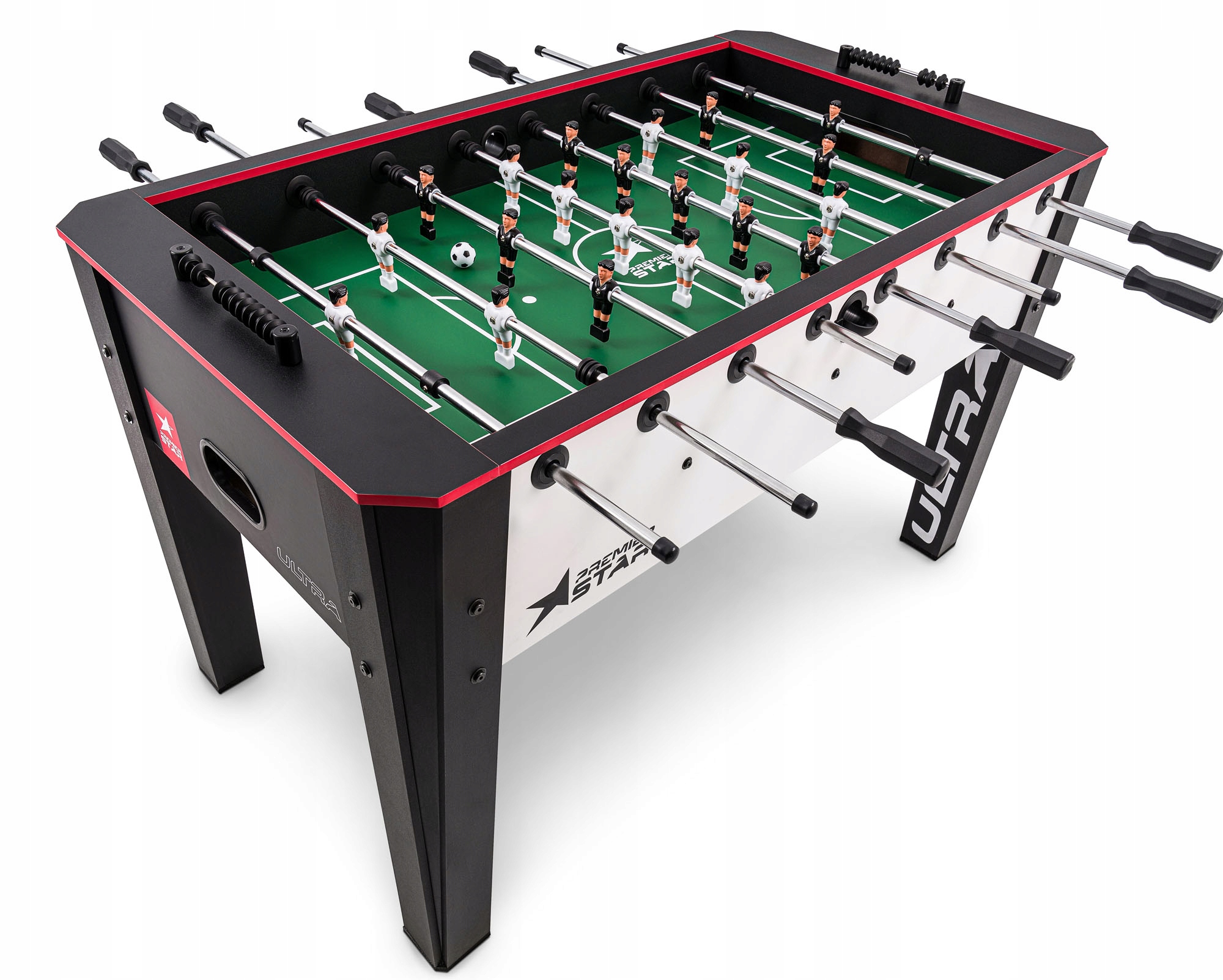 Настольный футбол Ultra благодаря своей конструкции идеально подходит для динамичных игр. Стол изготовлен из влагостойкой плиты МДФ и покрыт ламинатом ПВХ со структурой под дерево. Ножки стола имеют закрытые профили, что обеспечивает устойчивость во время игры. Стальные и цельные направляющие покрыты хромовым покрытием, что увеличивает их срок службы и устойчивость к износу.