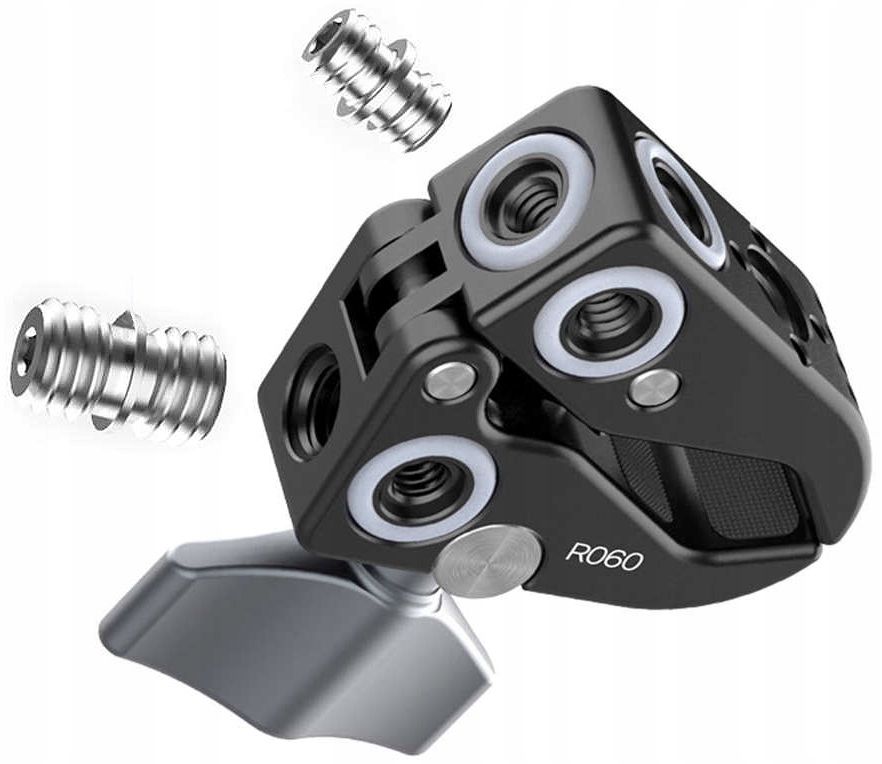 Эти маленькие тиски (82х56х20мм) оказываются незаменимыми во многих ситуациях. Расстояние между зажимными губками составляет почти 3 см (14-43 мм). R060 имеет восемь резьбовых гнезд. Шесть отверстий Ø1/4″ и два отверстия Ø3/8″, включая одно с отверстиями системы ARRI. Чтобы было интереснее, у нас также есть два переходника (1/4" и 3/8"), которые преобразуют "женскую" резьбу в "мужскую".