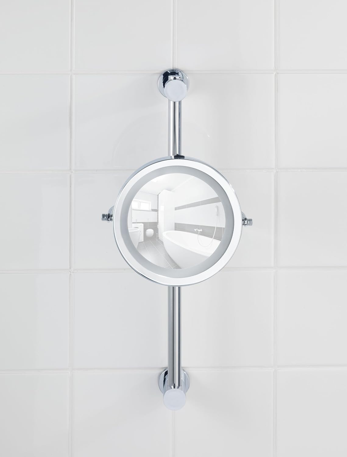 Круглое зеркало CAPRIимеет увеличение до 5 раз. Это позволяет очень точно выполнять многие мероприятия по уходу и благоустройству. Дополнительно зеркало имеет светодиодную подсветку, что обеспечивает качественный световой эффект с длительным сроком службы. Подсветку можно выключить или включить одной кнопкой. Конструкция ручки позволяет установить зеркало на смеситель душевой колонны.