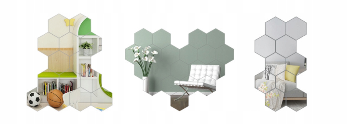 Зеркало, состоящее из 12 зеркальных шестигранников, позволяет создать самостоятельную композицию на стене или другой ровной поверхности.