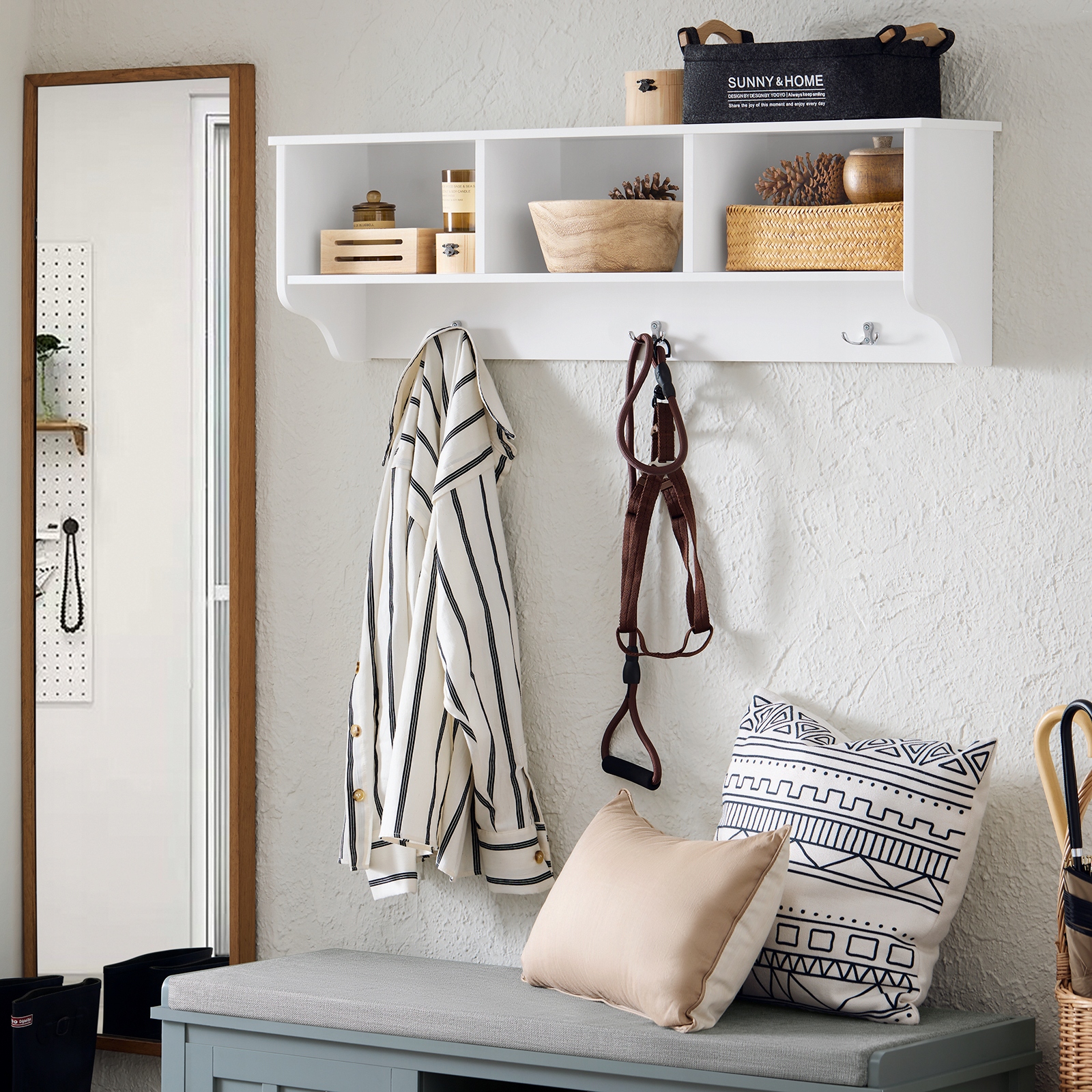 Настенные полки с местом для хранения — отличная альтернатива традиционным шкафам, особенно в небольших помещениях. С помощью трех практичных вешалок вы сможете поместить несколько пальто и курток, что сэкономит место в прихожей.