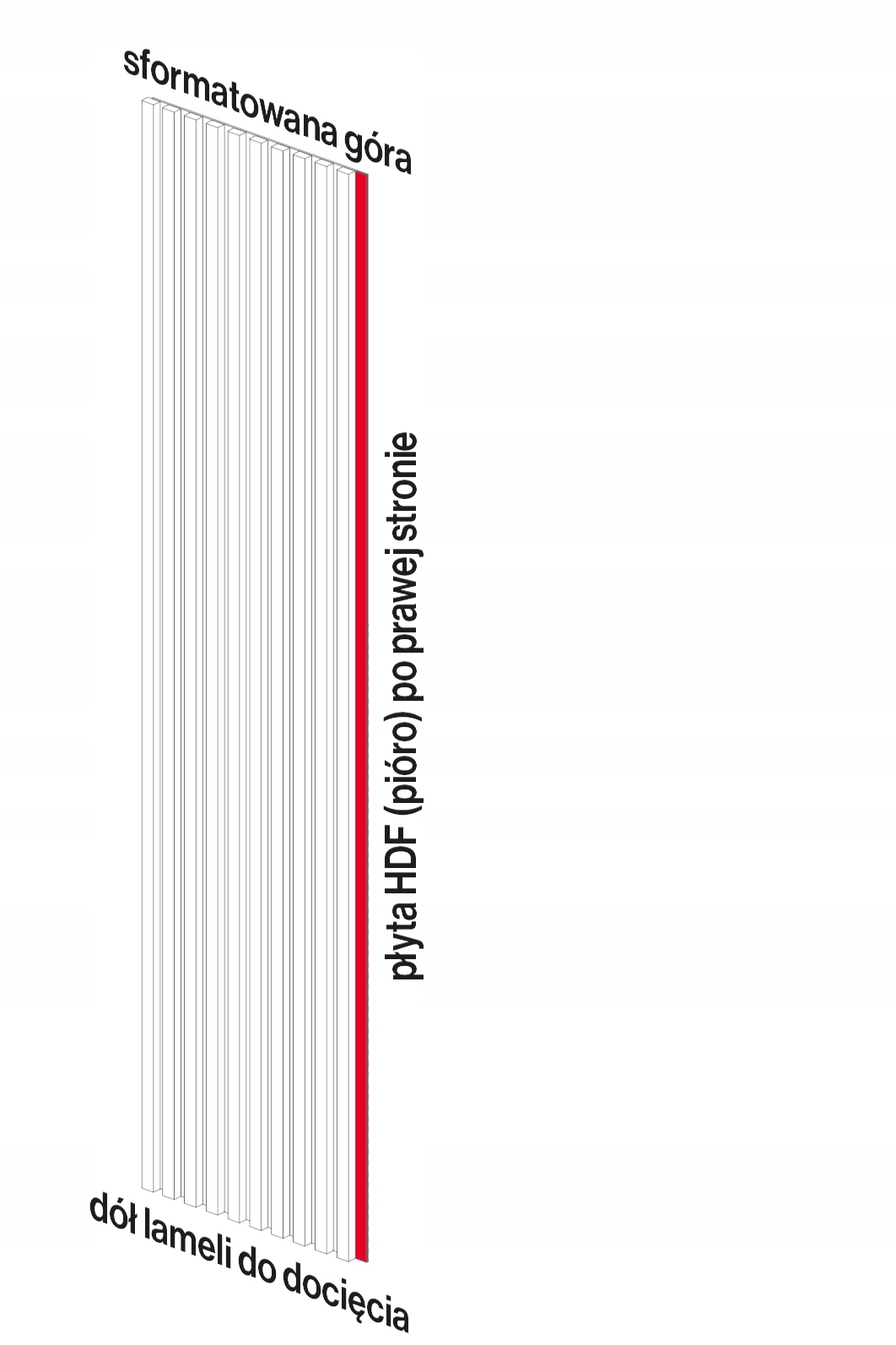Расположите панель напротив стены так, чтобы FEEL (плита HDF) находилась с правой стороны. Установите плинтус на место установки. Обратите внимание, что планки отформатированы сверху. Низ панелей следует отрезать до нужной длины самостоятельно. Длина панели (275 см) включает припуск на раскрой. Отметьте место, где будут отрезаны рейки.