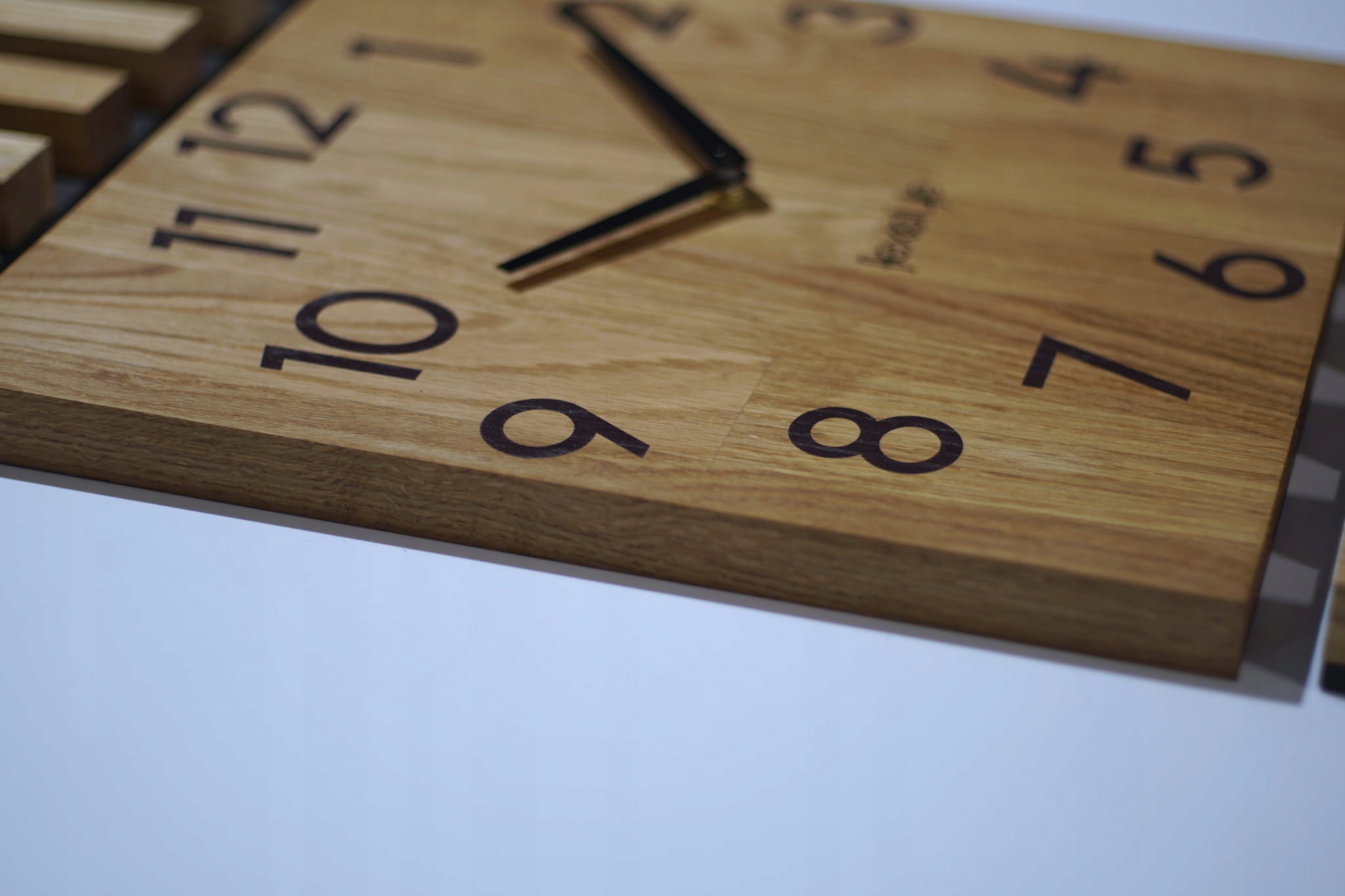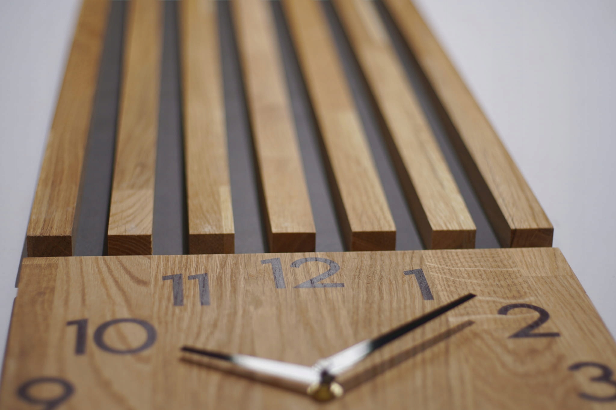 Само украшение состоит из 3-х независимых украшений. Сверху и снизу расположены панели с ламелями, а внутри размещены квадратные настенные часы. В отличие от общедоступных реек, наше изделие изготовлено из настоящей дубовой фанеры. Это касается как планок, так и самих часов. Планки установлены на черный МДФ.