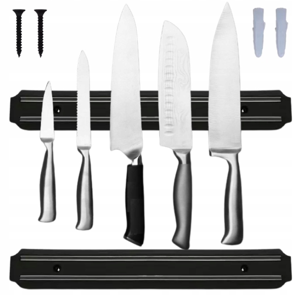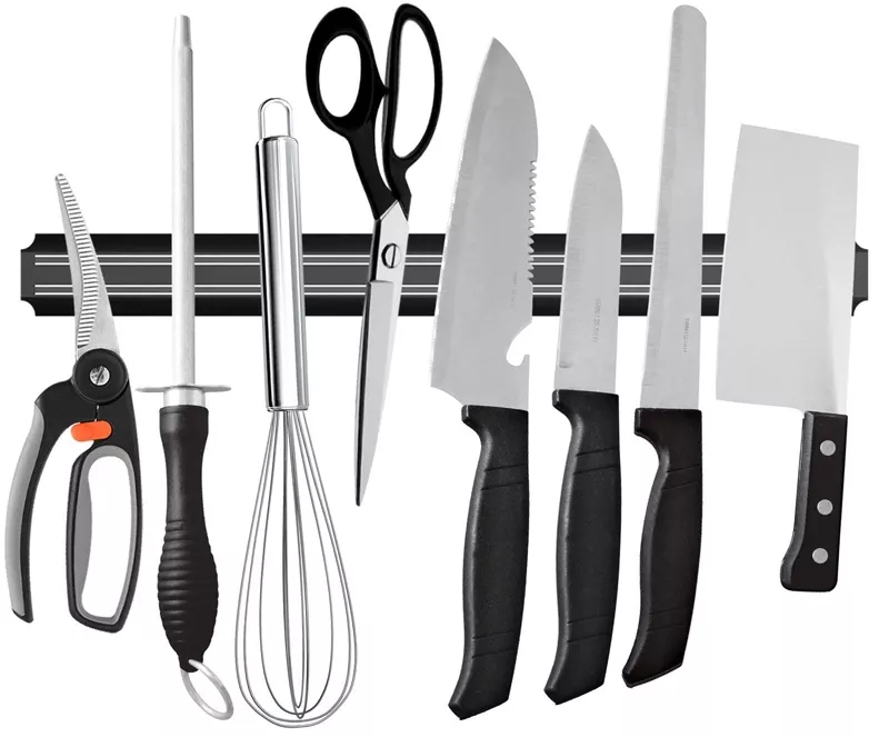 - Магнитную полосу можно повесить на стену, она удерживает ножи, кухонную утварь и другие металлические предметы.