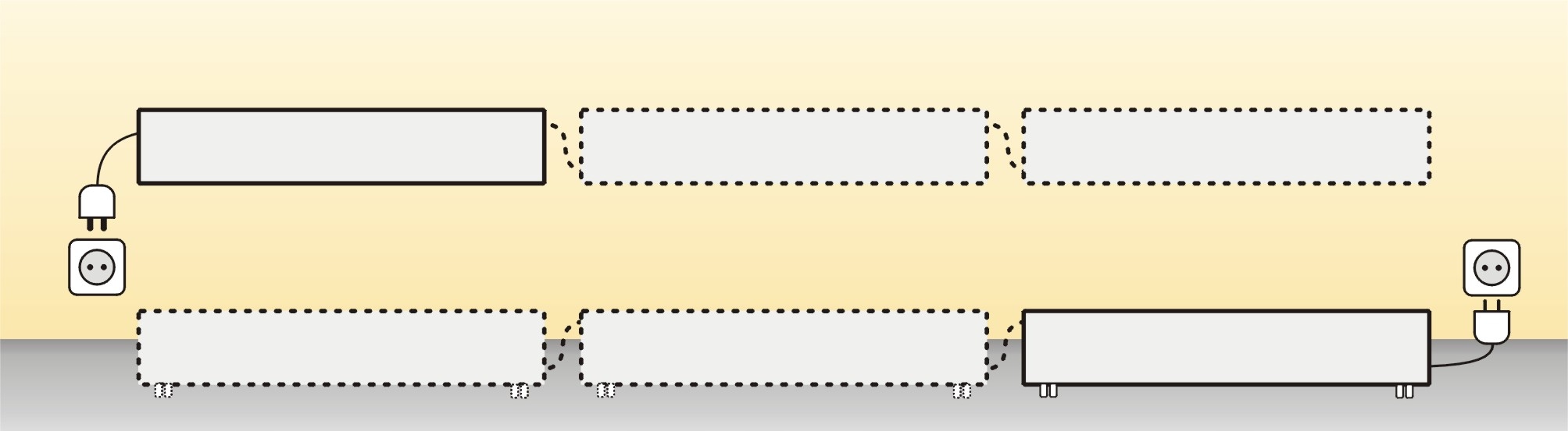 - возможность последовательного соединения, отопления и сушки «цепочками» с помощью выделенных кабелей: до 10 модулей с питанием от одной розетки