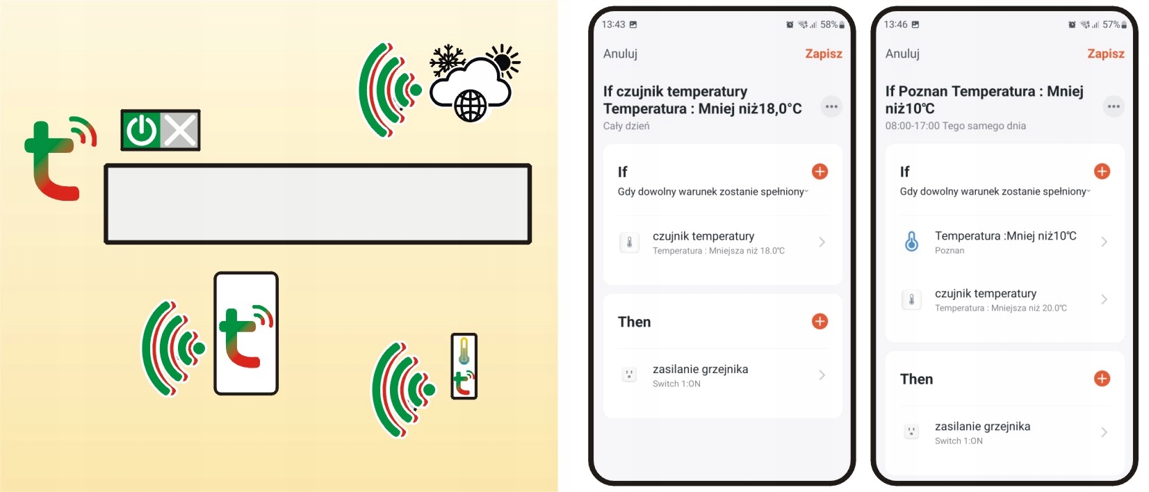 - возможность программирования настроек и сценариев включения и выключения отопления на основе информационного сигнала от отдельного WiFi датчика температуры и влажности - Tuya (приобретается отдельно)