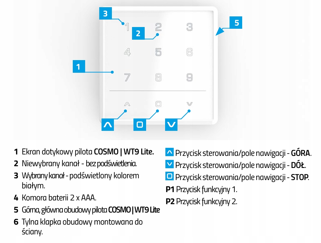 MOBILUS COSMO | WT9 Lite — это 9-канальный пульт дистанционного управления с сенсорным управлением, предназначенный для настенного монтажа и работающий в стандарте двусторонней связи COSMO | 2WAY.