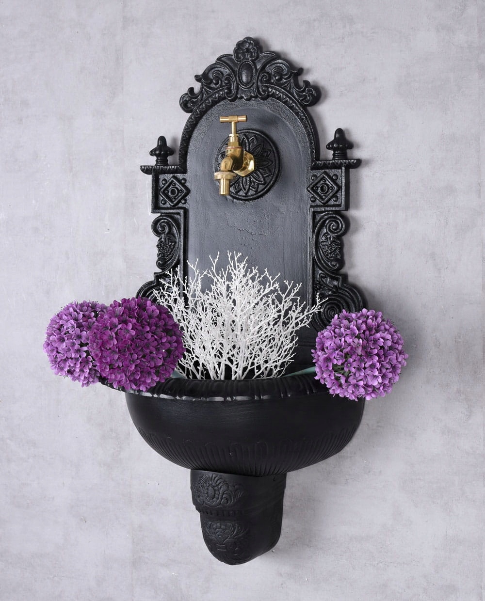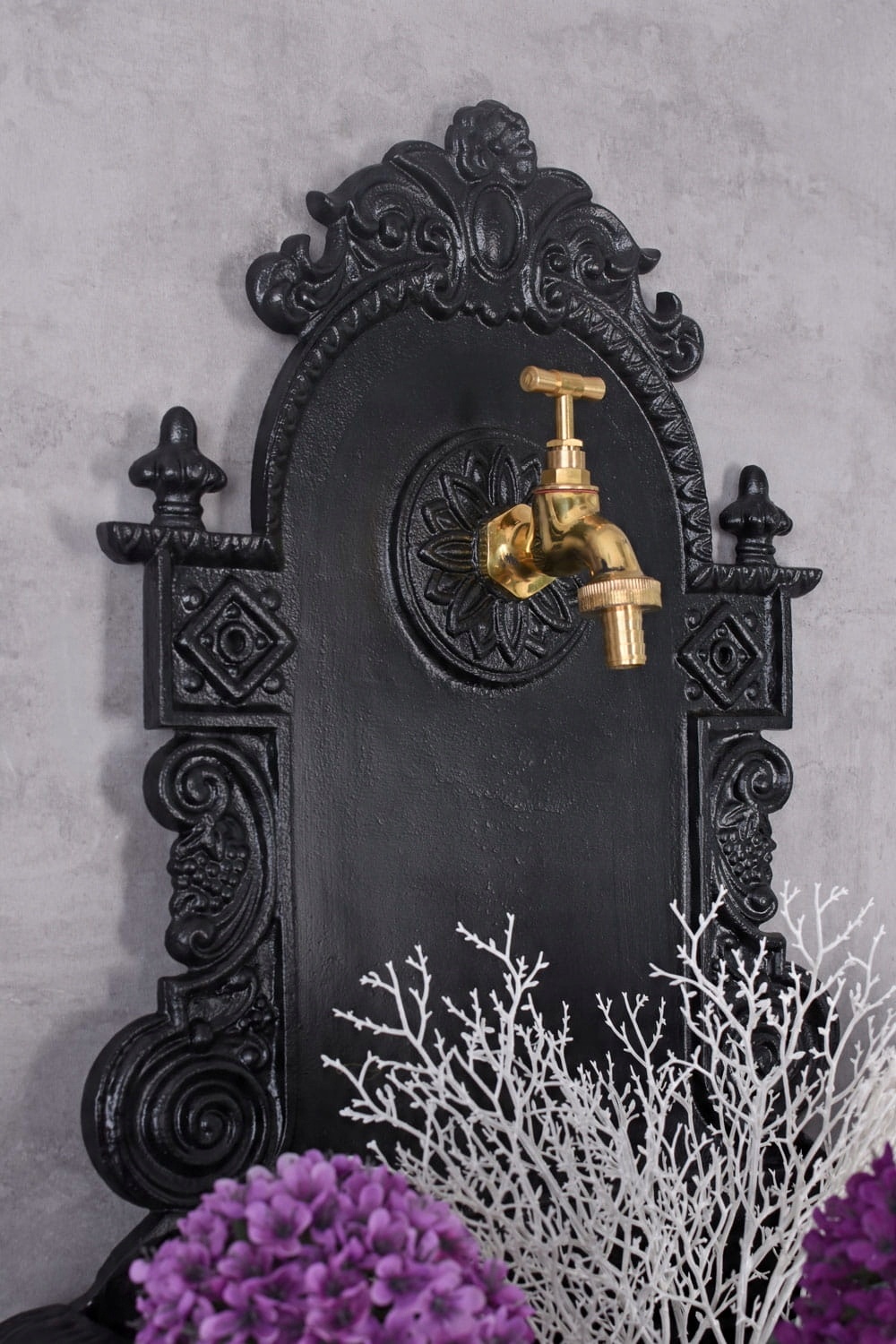 Хотите добавить элегантности и очарования в свой сад? Наш стильный настенный фонтан обязательно оправдает ваши ожидания. Созданный с вниманием к деталям, этот черный фонтан в стиле ренессанс с блестящим золотым краном привлечет внимание и придаст гармоничный характер вашему окружению.