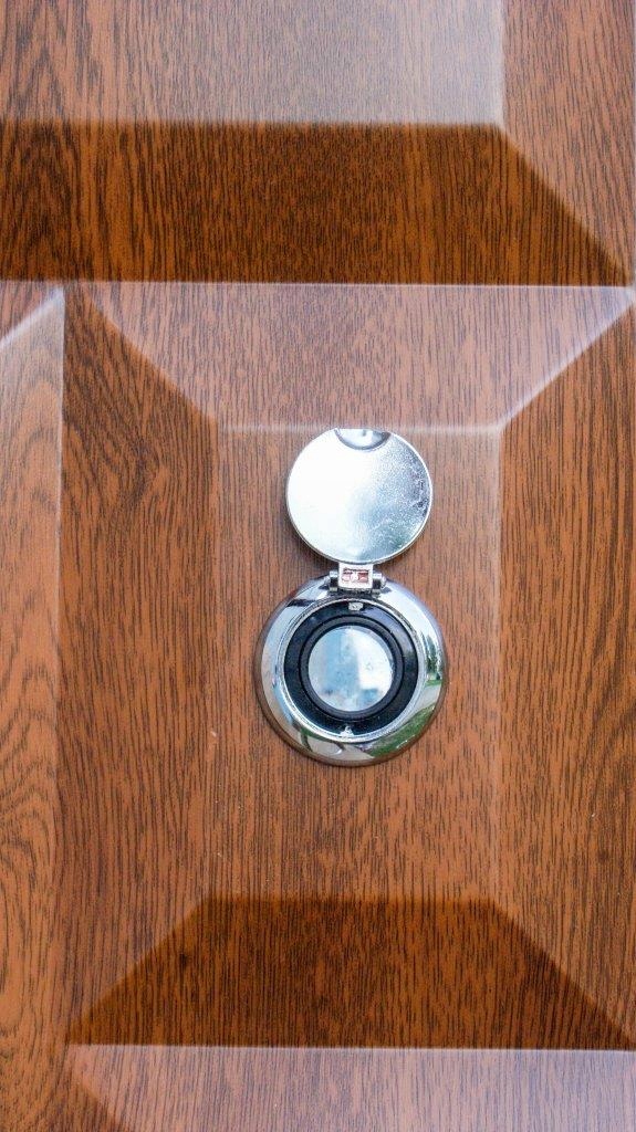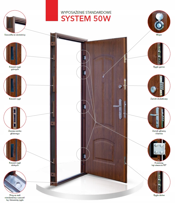 Двери оснащены одним центральным замком с девятью точками запирания, дополнительным дневным замком, независимым четырехточечным верхним замком и четырьмя регулируемыми петлями.