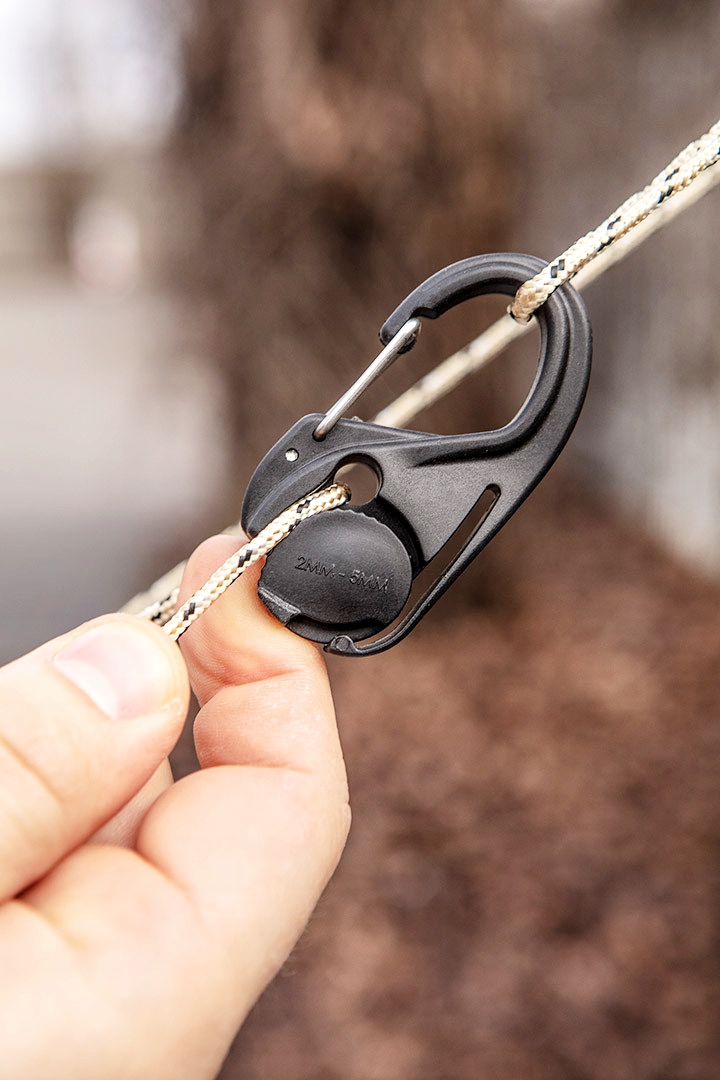 - Натяжители из нейлона (корпус) и стали (пряжка) позволяют застегивать и стропы без необходимости знать узлы. >
